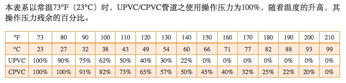 PS:有带螺牙的管线,UPVC部分不得超过110℉(43℃);CPVC部分不得超过150℉(66℃)。